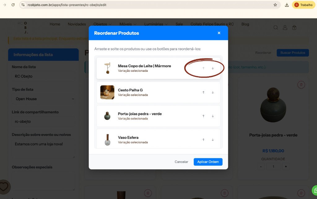 06. Depois de fazer sua seleção, voltar a lista e ordenar qual sua preferencia de produtos (Sequência de quais vocês mais gostariam de ganhar - apenar clicar em reordenar)